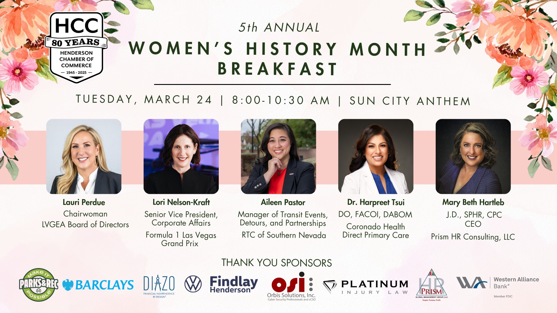 Join the Henderson Chamber of Commerce on Tuesday, March 24 for the 5th Annual Women’s History Month Breakfast, a program centered on leadership, experience, and the evolving role of women in Southern Nevada’s business and civic landscape.