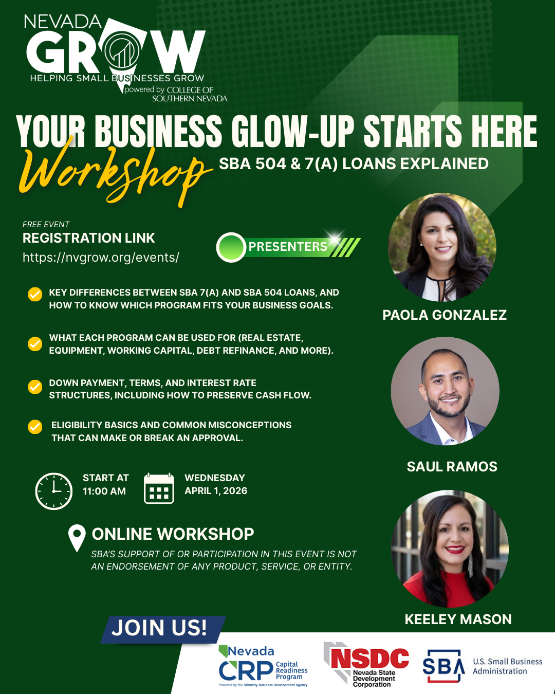 Nevada State Development Corporation (NSDC) experts are proud to collaborate with Nevada’s U.S. Small Business Administration (SBA) and Nevada Grow (NV Grow) to share valuable insights and resources for small business owners across Nevada. Together, we’re committed to educating our local business community and helping you access smart financing solutions designed to preserve cash flow and support long-term growth.